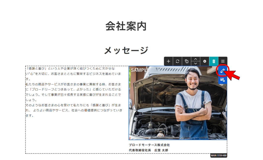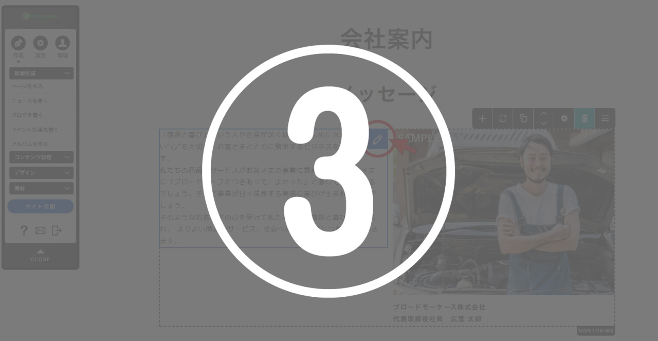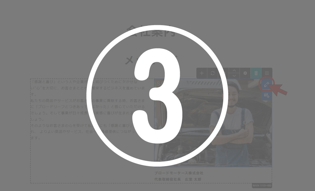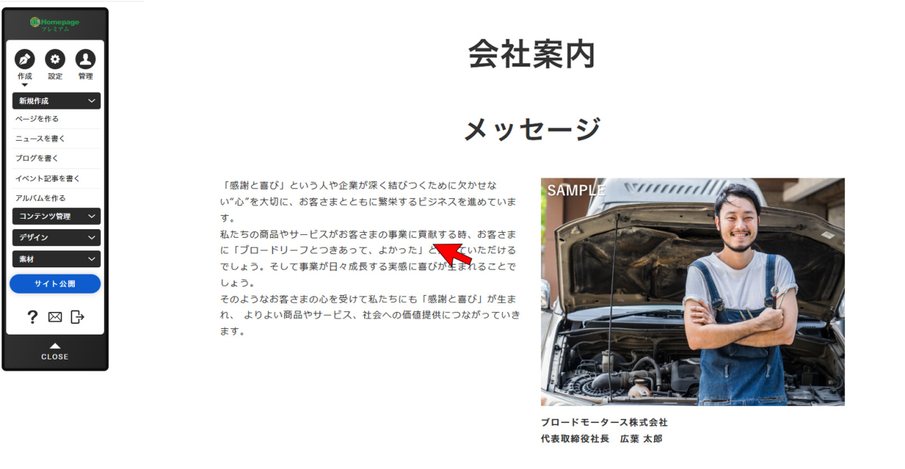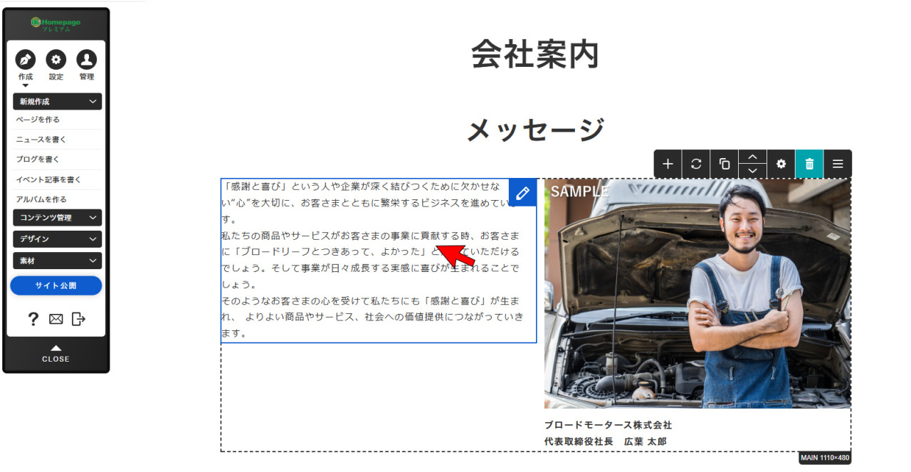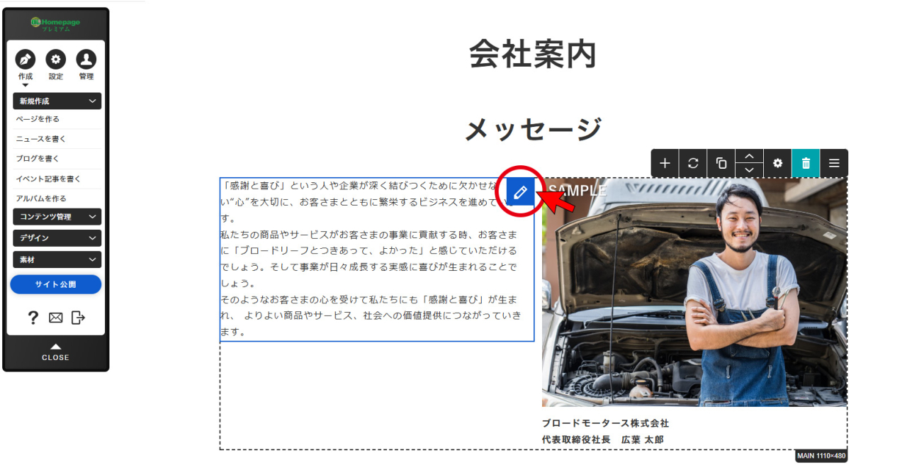 ※画像をクリックでも編集が可能ですが、クリックの仕方等により、フリーエディタを開いてしまったり、リンクが貼ってある場合はリンクが機能してしまうため、右上の[編集]
