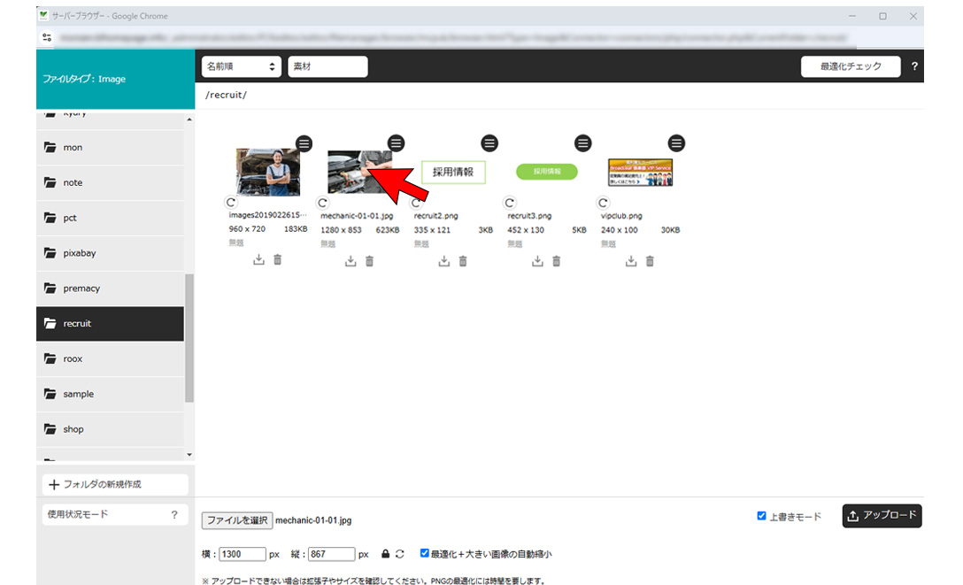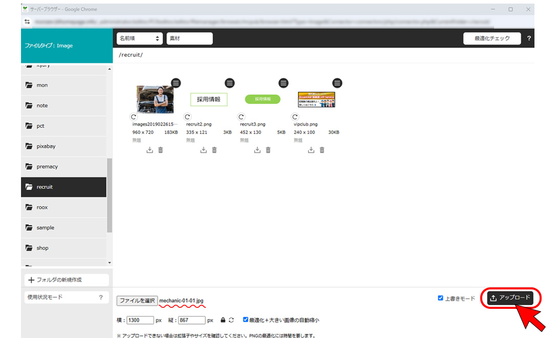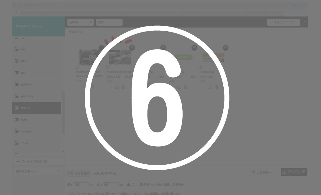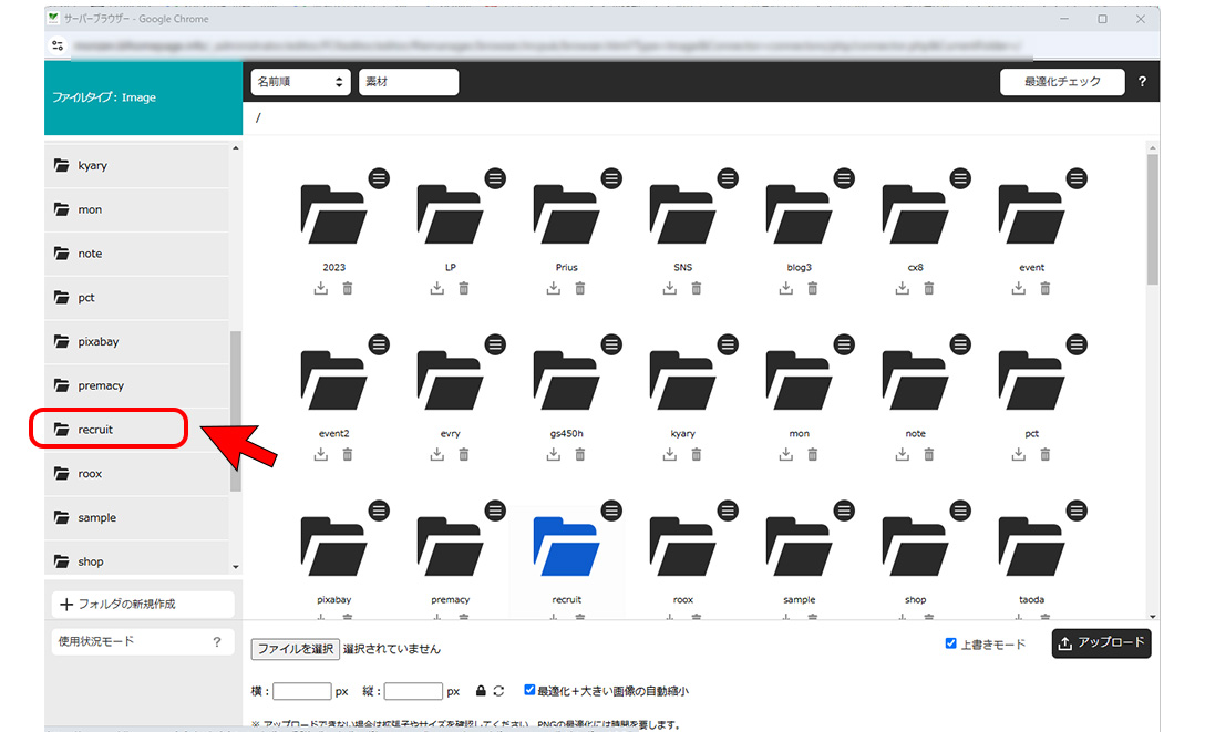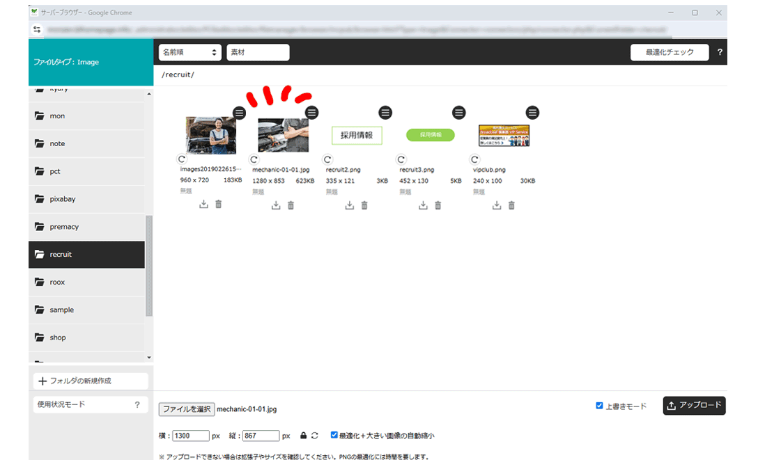※iPhoneの写真をアップロード後、サーバーフォルダで画像が表示されない時は拡張子を確認してください。heic形式には対応していません。