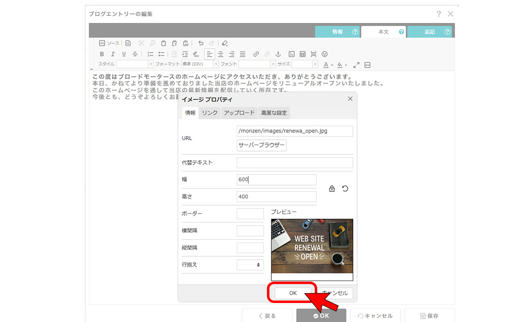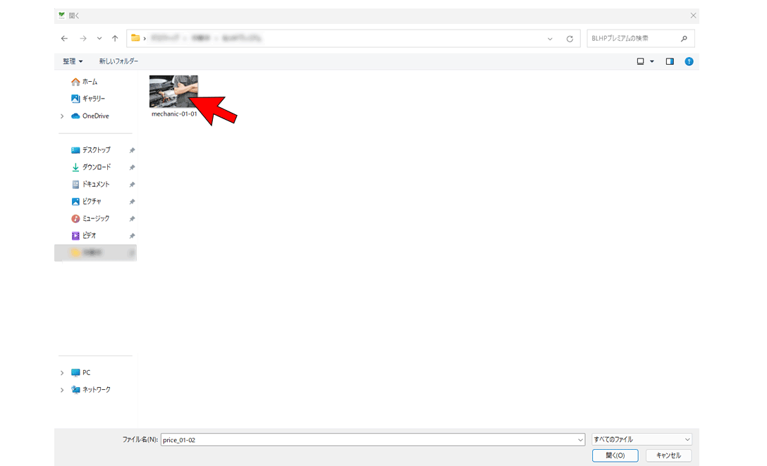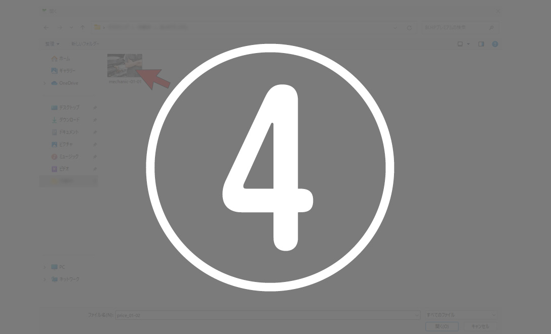 ④PCのフォルダが表示されるので、必要なファイルを選択し、「開く」をクリックします。(横幅は600~1280以下推奨)