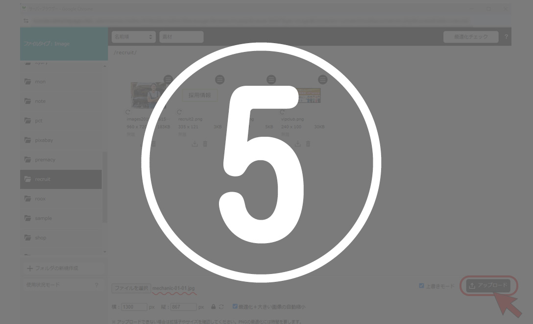 ⑤[アップロード]ボタンを押すと、「サーバーフォルダ」へアップロードが開始します。※元画像のファイル名に日本語を含む場合は英数文字のファイル名に置き換わります。