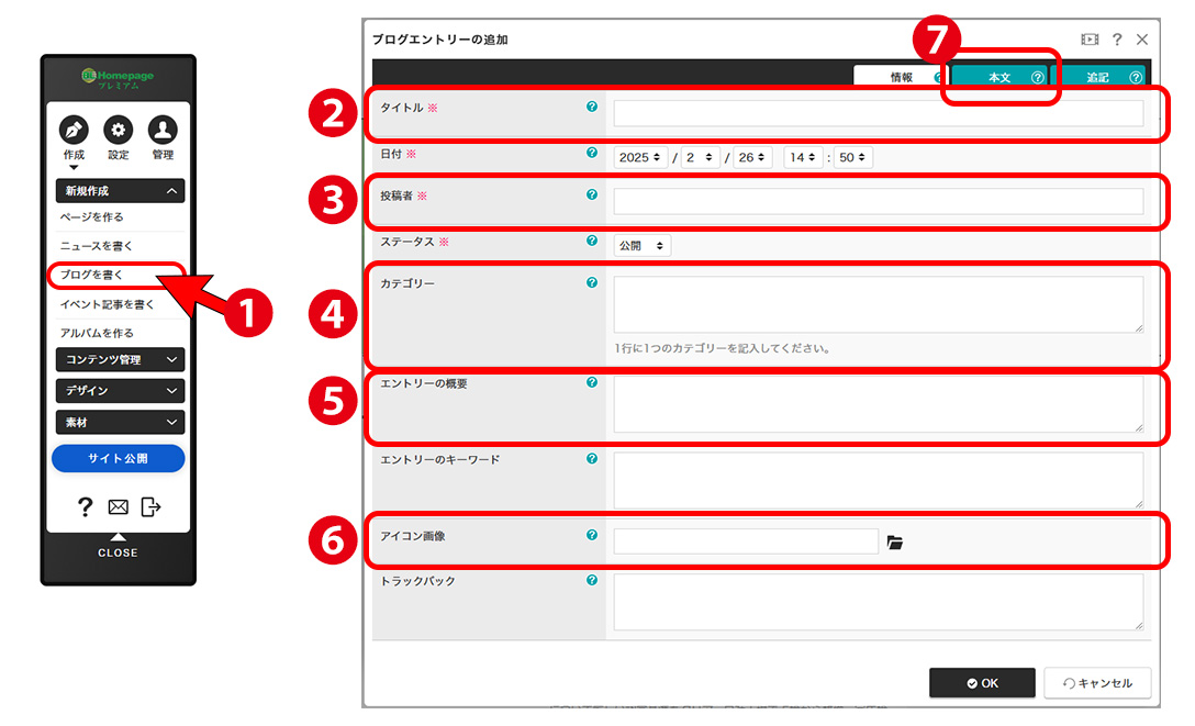 ①メニューから ⇒ 作成 ⇒ 新規作成 ⇒ ブログを書くを選択