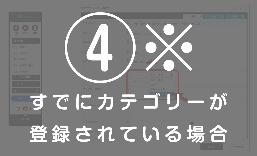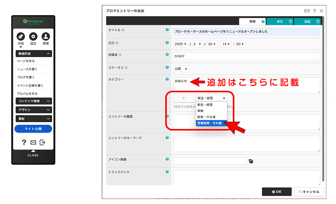 ※すでにカテゴリーが登録してある場合は、プルダウンメニューから選択して【 ← 】を押して確定。新しいカテゴリーを追加する場合はテキスト入力箇所にカテゴリーを記載する。