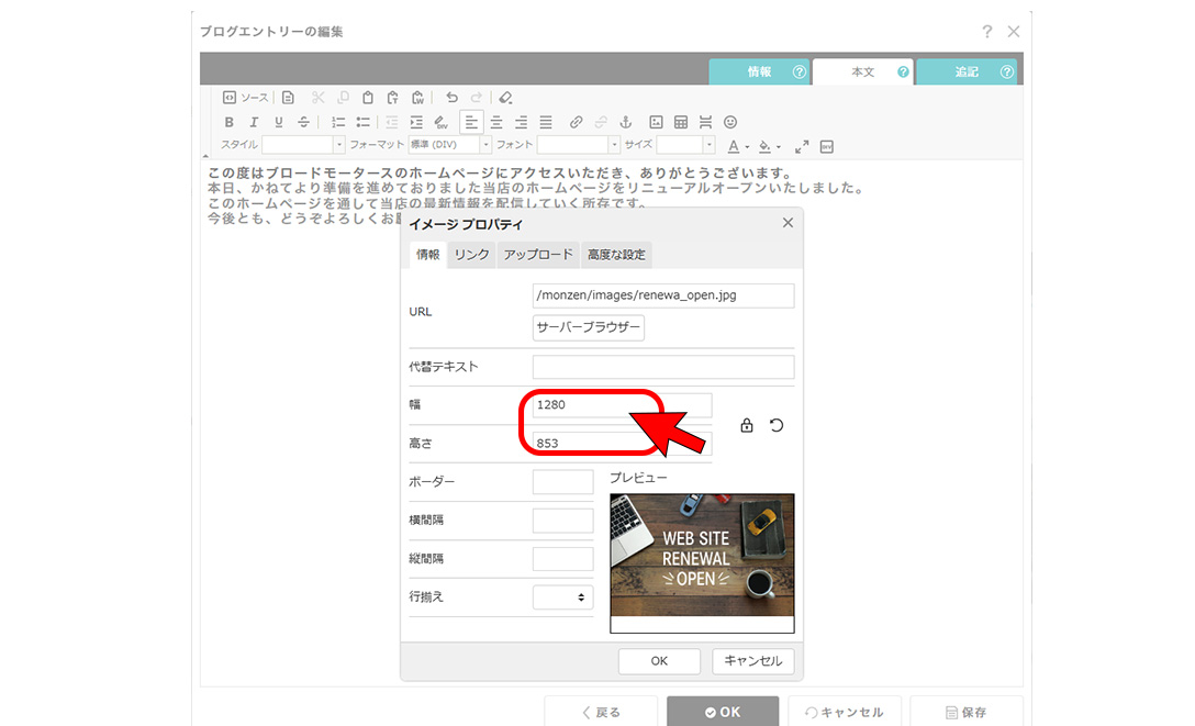 ⑤大きさを指定する。概ね横640程度で大丈夫 参考:1280だと画面一杯。